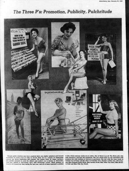 Using sexual attraction to sell is a basic strategy. In this 1960 ad women, advertisers are instructed on the “Three Ps: Promotion, Publicity, Pulchritude.” Draping women with exaggerated secondary sex characteristics on products such as seeds, pencils, and pickles ought to sell, right? The implication is that male consumers won't care about the quality of the pencils and pickles because they will be so besotted with the beauty of the women.