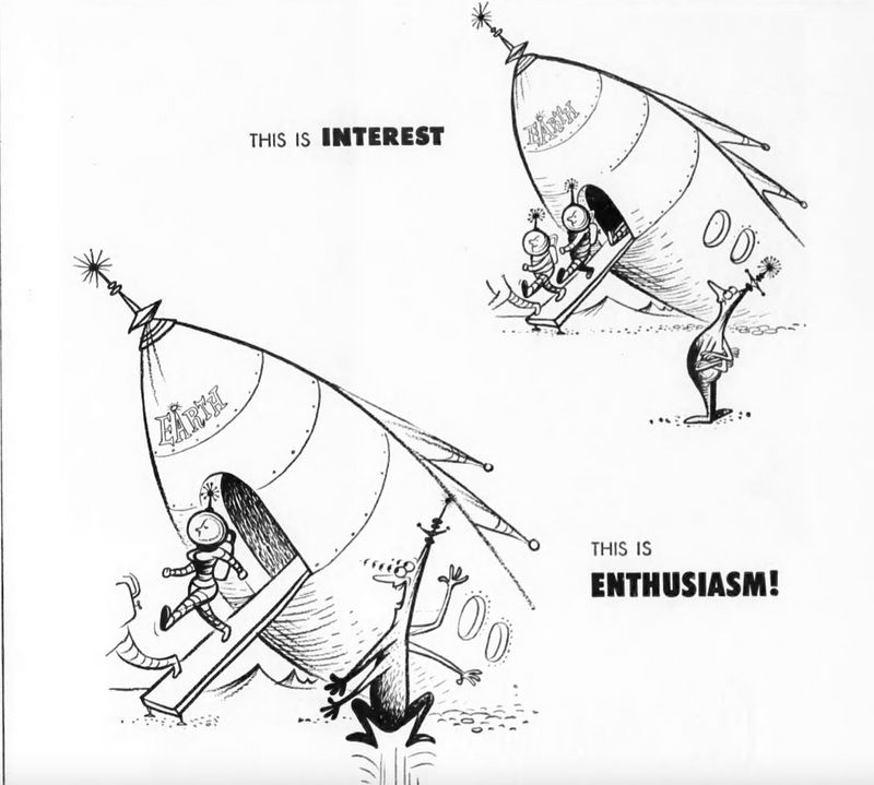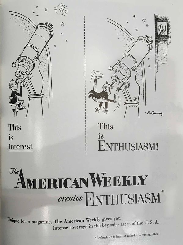 A magazine ran a series of house ads in 1953 that instructed advertisers on the difference between “interest” and “enthusiasm.” Sure, a consumer might be interested in a product, but what advertisers want is their enthusiasm because it "is interest raised to a buying pitch!" Here the astronomer is interested in the stars he sees through his telescope, but jumps off his seat in enthusiasm when he focuses it instead on the window of a woman undressing.