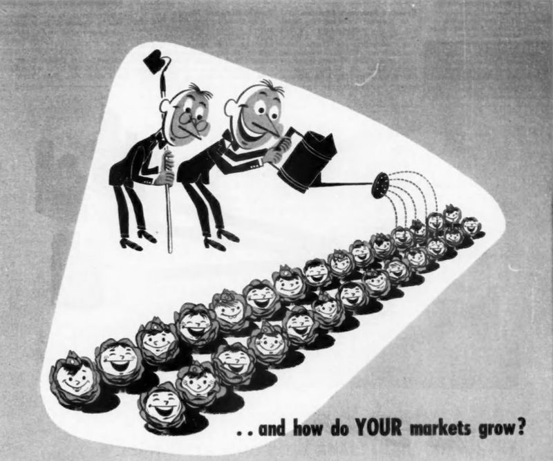 Here’s a 1951 ad that represents consumers as lettuce heads—brainless and passive—being watered (nurtured) by the advertising messages from a watering can, presumably held by an advertiser or agency or media outlet. “How do your markets grow?” implies that all that is necessary to increase sales is to simply spread that ad message on those passive smiling lettuce heads.